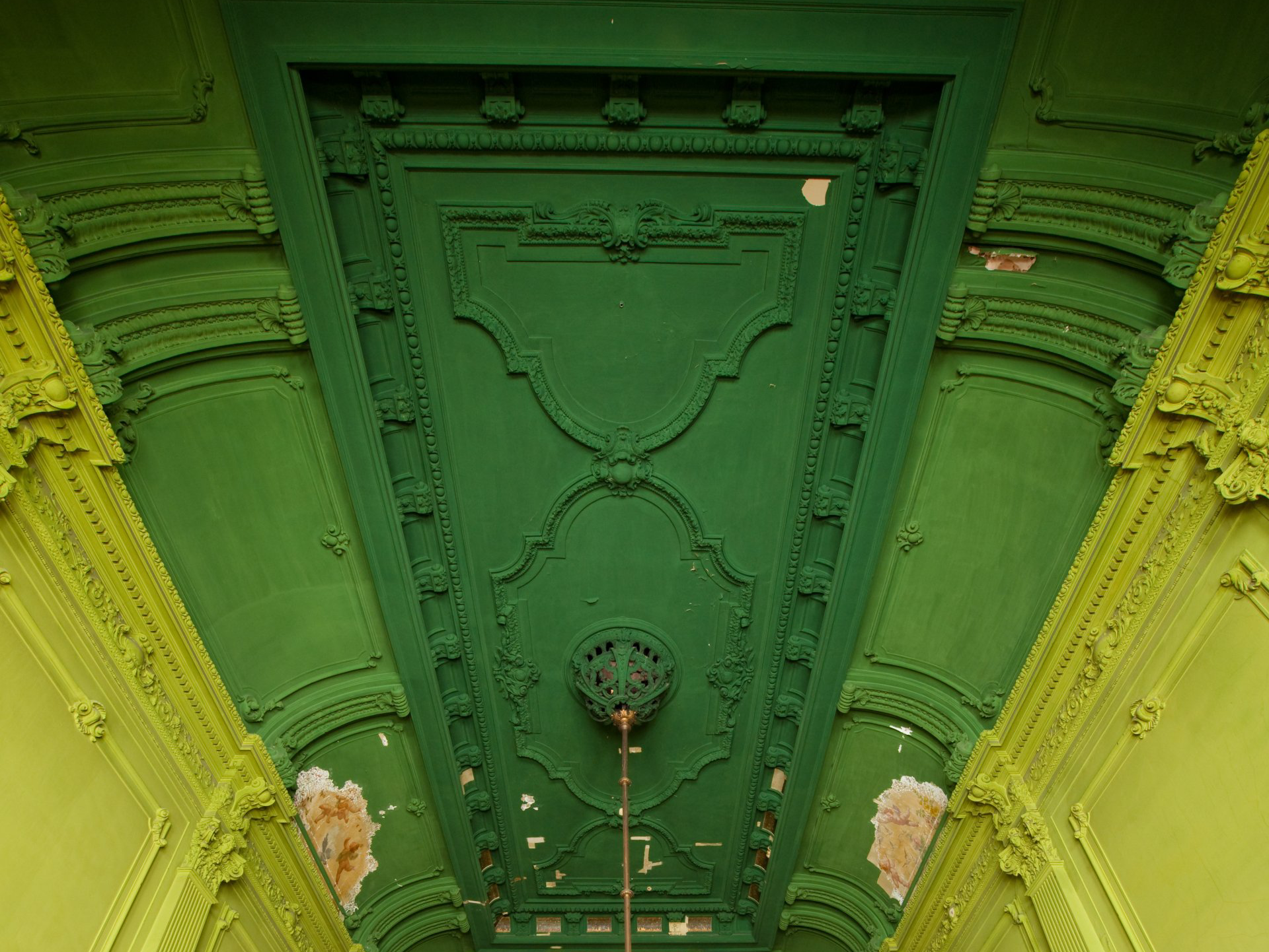 Im benachbarten sog. grünen Saal begannen die Restaurierungsarbeiten im März des folgenden Jahres. Zunächst wurden die alten Farbaufträge großflächig abgenommen und Untergrund vorbereitende Arbeiten durchgeführt. An den Bildflächen konnten die Übermalungen, die vermutlich aus den 1950er Jahren stammen, behutsam abgenommen werden. Da besonders die Bildflächen in der großen Voute starke Schäden aufwiesen, sind größere Rekonstruktionen fehlender Bildbereiche notwendig. Auch hier kann auf einen Fundus historischer Ansichten zurückgegriffen werden.